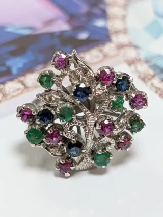 Elegante anillo antiguo con un diseño inspirado en un árbol, adornado con diversas piedras semipreciosas. esmeraldas, rubíes y zafiros todos ellos naturales Y 4 diamantes naturales - Diseño de árbol con ramas detalladas. - Incorpora gemas de colores variados como rubíes, zafiros, esmeraldas y diamantes - Montura en tono plateado.