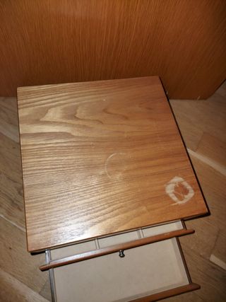 Joyero de madera, estilo clásico/antiguo, con gran capacidad de almacenaje y múltiples compartimentos. Características: 2 cajones con separadores interiores Compartimentos superiores para anillos, collares, pulseras y relojes Tapa abatible con espejo interior Interior forrado en tela clara Estructura sólida y estable Estado: usado. Presenta manchas visibles en la madera exterior (ver fotos), propias del uso y del paso del tiempo. No afecta a su funcionalidad. Se vende por cambio de mobiliario