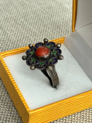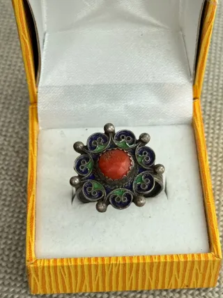 Vendo un anillo de plata con piedra de coral en el centro Alrededor tiene detalles de esmalte azul y verde, estilo tradicional / antiguo. Una pieza original y elegante (ver fotos). ✔️ Plata ✔️ Coral ✔️ Detalles esmaltados azul/verde ✔️ muy Buen estado