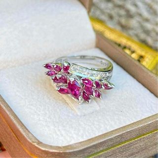🌸 Anillo vintage de oro blanco con rubí marquise – 15 rubíes naturales, rojo intenso con tono rosa. Incluye certificado. 💎 14 diamantes rosas, total 0,10 ct. Diseño antiguo. ⭐ Montura en oro blanco vintage, peso total 6,3 g, talla 56, ancho frontal 1,2 cm. ❇️ Rubíes naturales de alta calidad. Pieza antigua en excelente estado, garantizada.