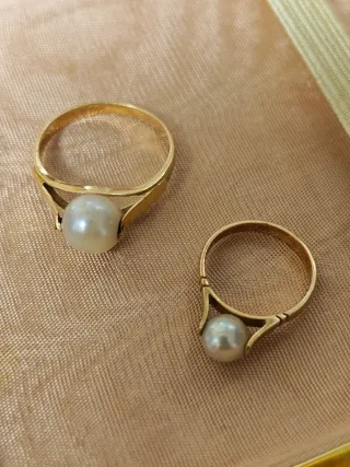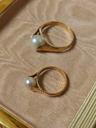 Elegantes anillos de oro de 18 quilates con perlas naturales Son muy antiguos... - Diseño clásico con perla central. - Montura de oro amarillo. - Dos unidades incluidas.
