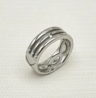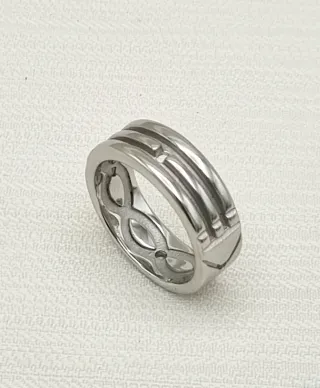Anillo Atlante, plateado. Es un diseño elegante y discreto. Amuleto. - Tres bandas entrelazadas. - Pequeño detalle central. - 4 agujeros estratégicamente hechos. La talla es la 14. No me deja poner la talla correcta.