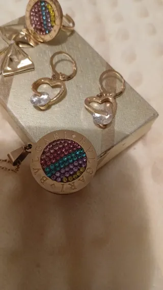Conjunto de bisutería con un diseño elegante y llamativo. Bulgari,de acero en muy buen estado - Anillo con piedras de colores. - Pendientes con forma de corazón y piedra. - Colgante circular con piedras de colores. 15€