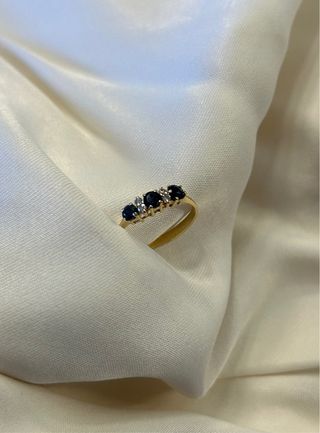 Oro amarillo 18k. 3 zafiros naturales color azul de 3mm cada uno. 4 brillantes naturales talla diamante de algo menos de 2mm cada uno. 17mm de diámetro- Talla 15 española Antes de comprar escribir.