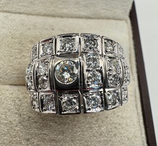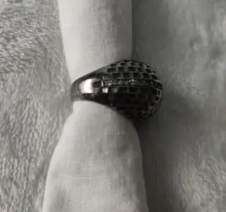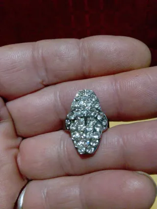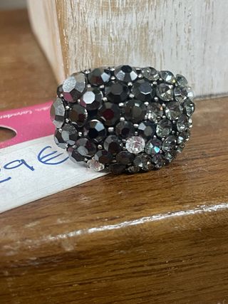 Anillo de fantasía con un diseño llamativo y adornado con múltiples piedras brillantes. - Diseño alargado y ovalado. - Cubierto de pequeñas piedras transparentes. - Montura plateada.caja antigua ,