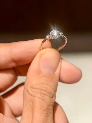 Elegante anillo con moissanita central y dos circonitas a los lados. Un diseño delicado y brillante. - Montura de plata. S925 - Piedra central tipo moissanita. - Circonitas de piedras laterales.