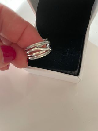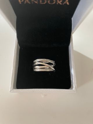Elegante anillo de la marca Pandora, con un diseño entrelazado y adornado con pequeñas circonitas brillantes. - Diseño entrelazado. - Detalles de circonitas.