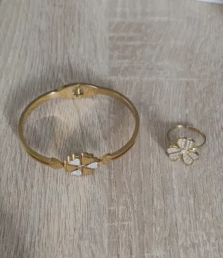 Anillo con un diseño inspirado en hojas doradas. - Estilo abierto y ajustable. - Acabado metálico brillante.