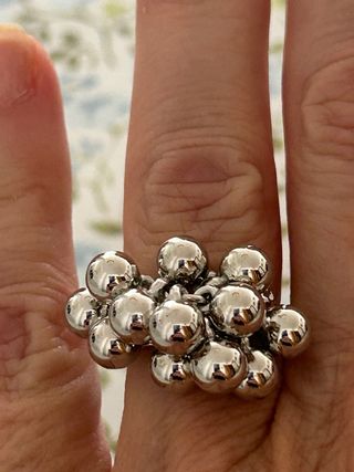 Anillo con un diseño único y llamativo, perfecto para añadir un toque especial a tu estilo. - Elaborado con un acabado plateado brillante. - Presenta un conjunto de esferas interconectadas.
