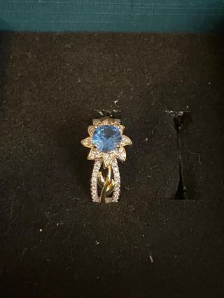 Elegante anillo de oro 14k laminado con un hermoso zafiro azul central, rodeado de pequeñas gemas brillantes. - Diseño ovalado con detalles ornamentales. - Montura dorada. - Gema central de color azul intenso. - Acompañado de gemas transparentes.