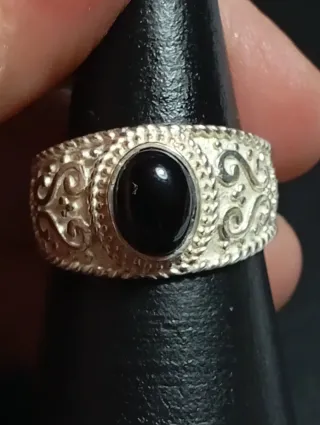Elegante anillo de plata de ley con un cautivador diseño. - Piedra central de ónix negro. - Detalles ornamentales en la banda. - Acabado plateado brillante.