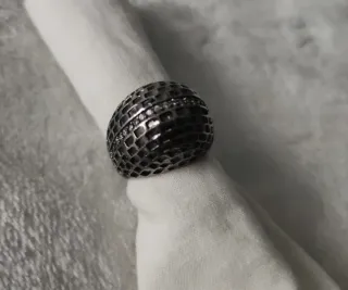 Anillo de bisutería con un diseño texturizado y detalles de pedrería. - Diseño esférico y Acabado metal envejecido amartillado con hilera central piedras brillantes.