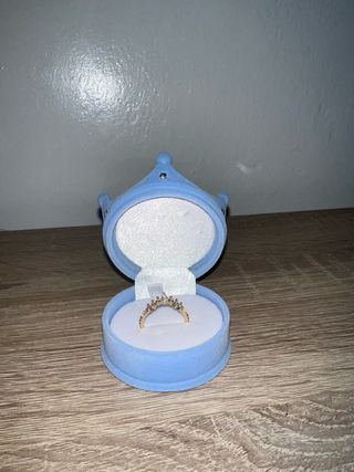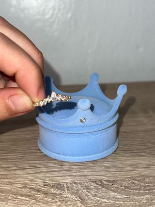 Este anillo de estilo princesa viene acompañado de una encantadora caja con forma de corona. Anillo con diseño de corona, ideal para quienes buscan una joya elegante y femenina. Presenta un acabado dorado y está decorado con pequeñas piedras brillantes cuidadosamente engastadas.Su forma curva lo hace perfecto para llevar solo o combinado con otros anillos. Se entrega en un estuche aterciopelado azul con forma de corona, ideal para regalo o para una presentación especial. ✨ Ideal para: regalárselo a tu mujer, novia, amiga... familiar