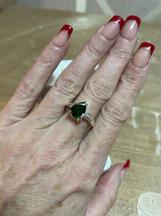 Elegante anillo con un diseño llamativo. - Piedra central de color verde intenso. - Detalles de pequeñas piedras brillantes en la banda. - Montura de plata.