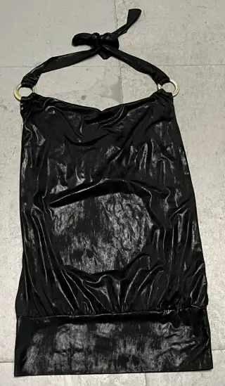 Top brillante con un diseño moderno y llamativo. - Detalle de anillas metálicas en los tirantes. - Tejido con acabado satinado. - Tira para atar al cuello. Segunda mano, marca wme, talla M, poliéster y elastan