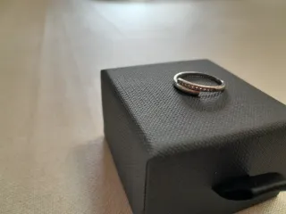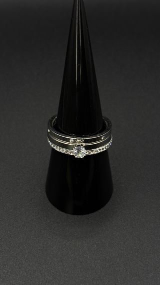 Anillo con un diseño elegante y adornado con piedras brillantes. - Banda con doble hilera de piedras. - Acabado oscuro en la banda.-Talla M.