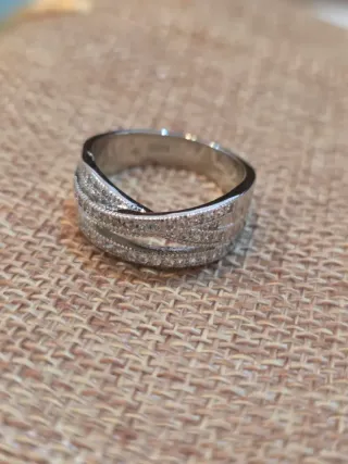 Elegante anillo de plata con un diseño entrelazado y detalles de pequeñas piedras brillantes. - Material: Plata - Talla: 23 (diámetro 22.6 mm) - Diseño: Entrelazado con piedras incrustadas