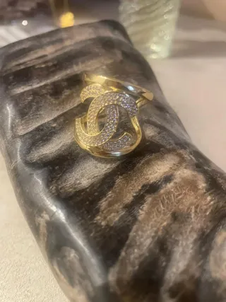 Elegante anillo con diseño inspirado en la icónica doble C de la marca. - Detalles de circonitas brillantes. - Acabado en tono dorado.