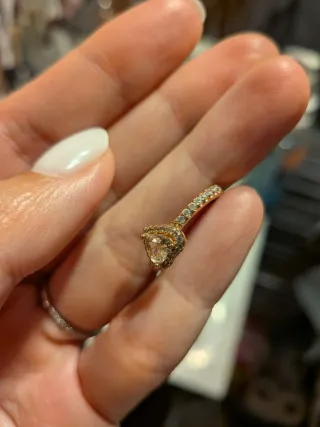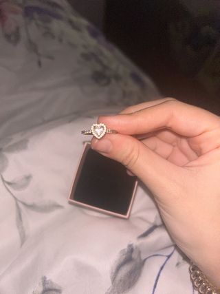 Elegante anillo Pandora con diseño de corazón y baño de oro rosa. Una pieza delicada y brillante. - Diseño de corazón. - Baño de oro rosa. Nuevo sin estrenar, fue un regalo, talla 54 que equivale también a la talla 14-15. Precio original 99