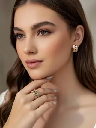 Conjunto de anillos con un diseño elegante y detalles en oro. - Tallas 12- 14 - 15 - 17 - 18,5 - Fabricados en Gold Filled. - Cada anillo presenta una piedra central de color verde, rojo y azul. - Diseño con detalles texturizados y un acabado brillante.