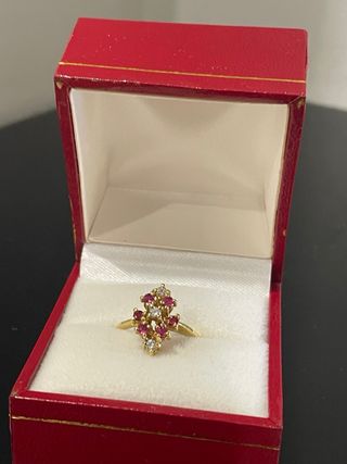 Elegante anillo de oro de 18k años 70 principios de los 80 con diseño floral de rubíes y brillantes. Talla 11 de anillero Perfecto estado, sin uso Marcas del oro y diamantes Pieza muy bonita y vistosa. Perfecto para todas las edades, ideal para chica joven. Pieza en plena tendencia. NO se devuelven las joyas NO preguntéis el peso, ya tiene un precio MUY competitivo Todas mis piezas han sido previamente cotejadas por expertos por lo que lo que lees/ves, es lo que hay.