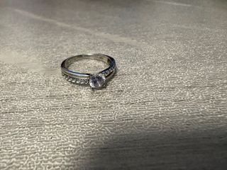 Elegante anillo de oro blanco de 9 quilates. Presenta un diseño clásico con una piedra central brillante y detalles de pequeñas gemas a lo largo de la banda. - Oro blanco 9K - Piedra central - Detalles de gemas *precio negociable
