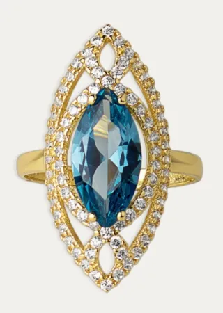 Elegante anillo de oro amarillo 9 k lanzadera. - Piedra central: Topacio azul con talla marquesa. - Detalles: Acompañado de pequeñas circonitas brillantes. - Diseño: Estilo lanzadera o marquise, muy sofisticado.