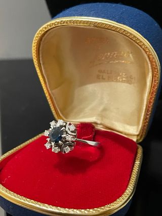 Importante sortija vintage de finales de los años 70 en oro blanco 18k estilo roseta con zafiro central y brillantes Es una pieza preciosa, más aún en directo y con un brillo espectacular. Maciza (5,7 gramos) con una montura muy sólida. Talla 15 de anillero. Fácil de llevar a diferencia de otros modelos similares de la época, muy ponible. Precio ajustado para la pieza que es. Ideal sortija de pedida o aniversario. Te encantará.