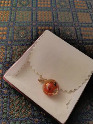 Colgante con diseño de bola del mundo, elaborado en oro de 18 quilates y esmalte. - Tiene anilla triangular para meter la cadena y perno de oro que traspasa la bola entera. - Detalle de esmalte en tonos naranja. - Acabado brillante. Resto de tienda cerrada por jubilación nuevo sin estrenar. Por favor no hacer ofertas ofensivas. Marco los precios que me parecen correctos. Lo puedo entregar en Madrid, Ávila o Segovia o enviar a casa.