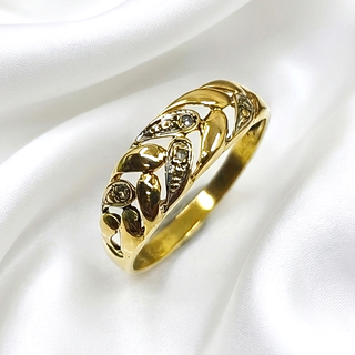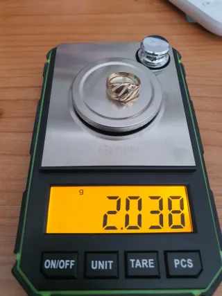 Elegante anillo de oro de 14 quilates adornado con cinco brillantes. - Diseño con bandas onduladas - Cinco pequeños brillantes incrustados. - Su peso es de 2,038 gramos como se puede ver en báscula. Su precio es de 150€ Más fotos por privado. Sólo se aceptan envíos por Correos. Pagos en mano *PLAZA ELIPTICA*, y reservas solo por transferencia bancaria, ingreso en cuenta, por app, PayPal o Bizum. Envíos a cargo del comprador.