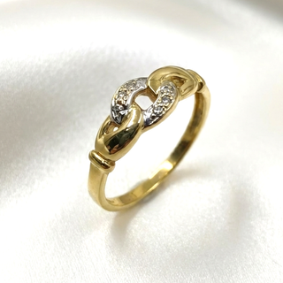 Elegante anillo con diseño de nudos entrelazados, adornado con pequeñas piedras brillantes. - Fabricado en oro laminado de 14 quilates. - Diseño detallado y llamativo.