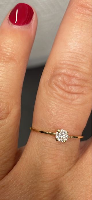 Tipo: Solitario. Género: Dama. Material: Oro amarillo 18K. Piedras: Diamante. Talla: Brillante 0,20 cts aproximadamente. Peso: 1,86 gr. Talla: 17,5 mm. Estado: Muy buen estado. Óptica muy buena. Envío asegurado y certificado: Sí. Caja: Sí.