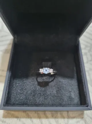 Elegante anillo de oro blanco de 18 kt con una aguamarina central y diamantes talla brillante a los lados. Talla 8, se puede ajustar de talla. Sin estrenar. Se entrega con certificado y caja.