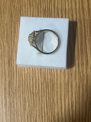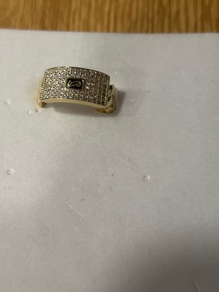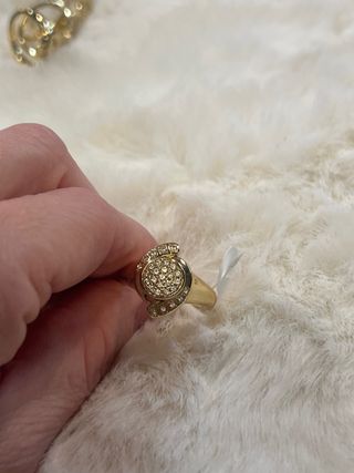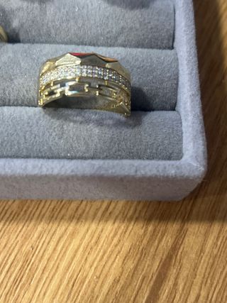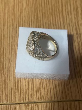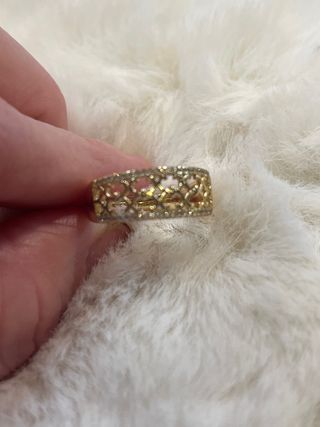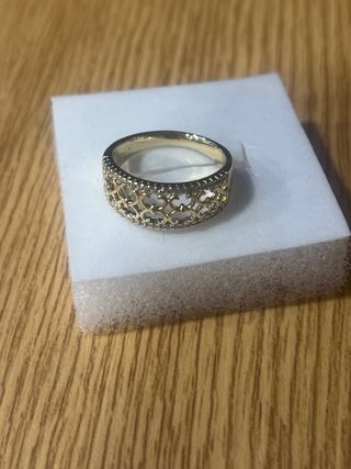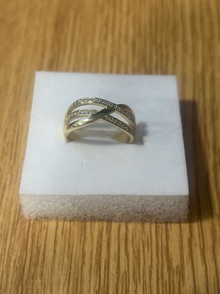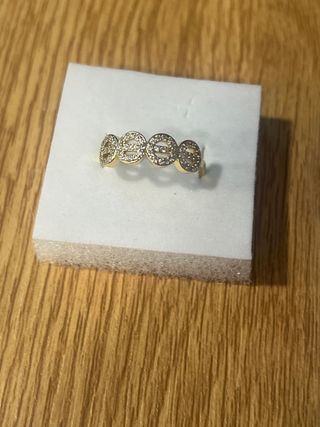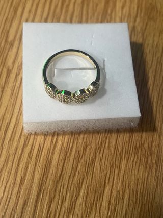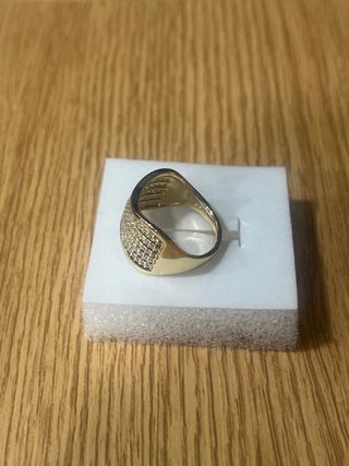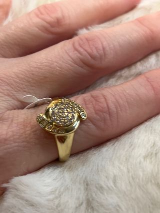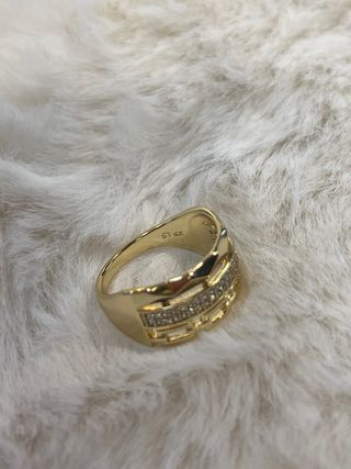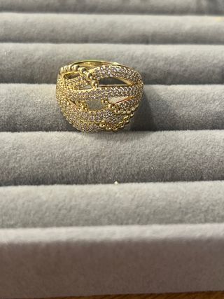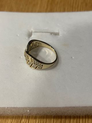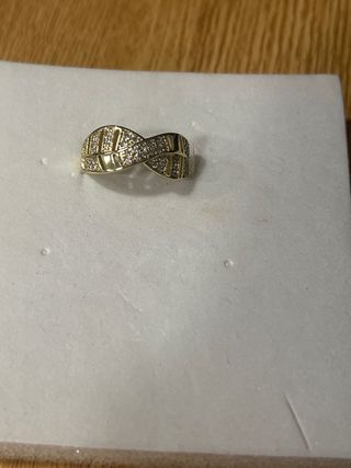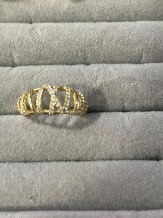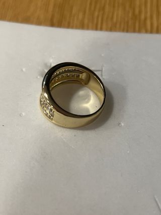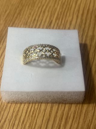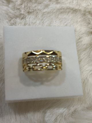 Anillo laminado en oro de 14 quilates con incrustaciones de piedras blancas. - Diseño elegante y brillante. - Talla 9 (19 mm de diámetro).