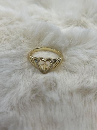 Elegante anillo laminado en oro de 14 quilates con un diseño de corazón y cruz. - Detalles de circonitas brillantes. - Diseño abierto en forma de corazón. - Cruz central. - Acabado brillante.