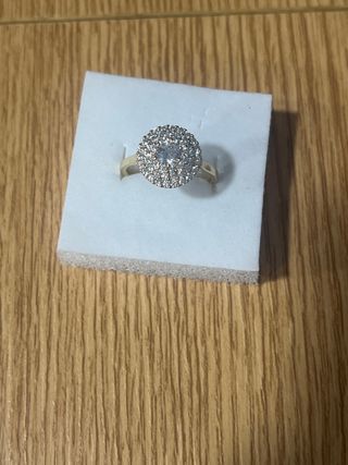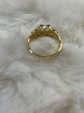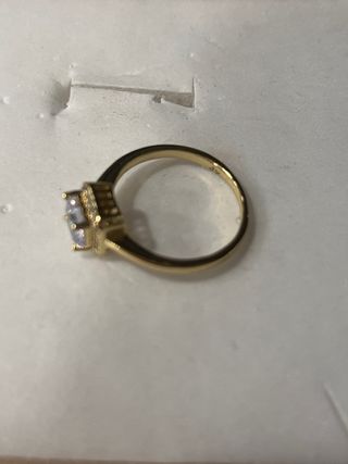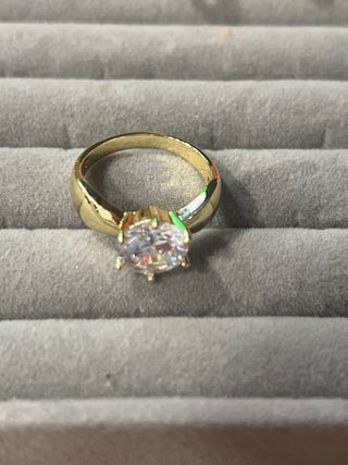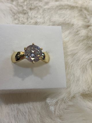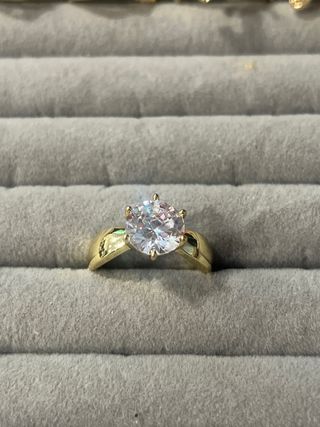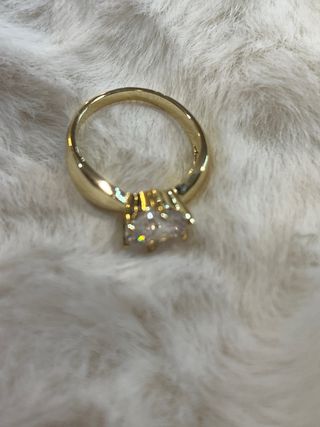 Elegante anillo laminado en oro de 14 quilates. - Diseño clásico con una piedra central brillante. - Acabado en tono dorado y blanco.