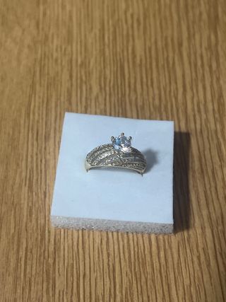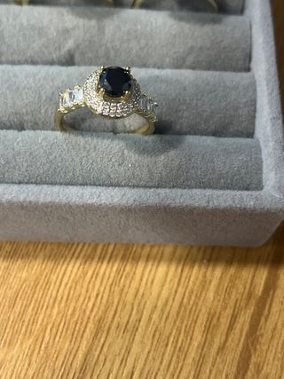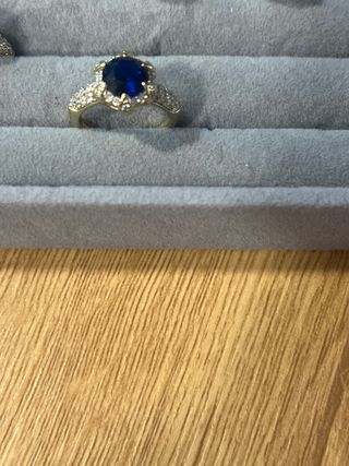Elegante anillo laminado en oro de 14 quilates XP con un llamativo zafiro azul central. La banda está adornada con pequeñas piedras brillantes. - Talla del anillo: 6 (equivalente a 16.5 mm de diámetro). - Metal: Oro laminado 14K XP. - Piedra principal: Zafiro azul. - Detalles: Acompañado de pequeñas piedras incrustadas en la banda.