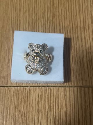Anillo con diseño de oso y corazón central. El oso está adornado con pequeñas piedras brillantes y tiene detalles en negro para los ojos. - Baño de oro de 14 quilates. - Corazón central grande y transparente. - Detalles de circonitas cúbicas.