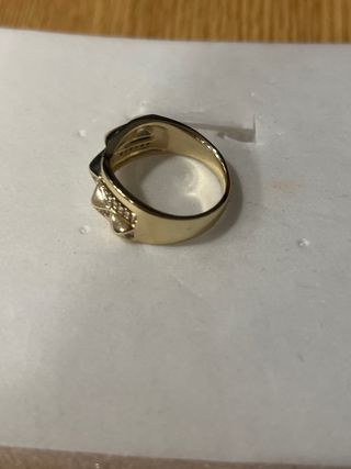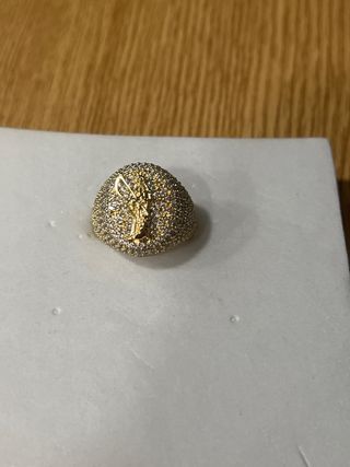 Anillo laminado con un diseño detallado y adornado con pequeñas piedras brillantes. - Laminado en oro de 14 quilates. - Talla 7 (diámetro aproximado de 17.3 mm). - Diseño con figura central y circonitas incrustadas. -figura de santa muerte.