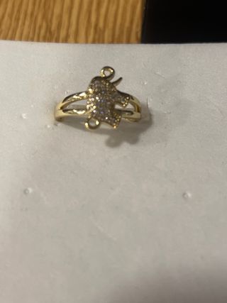 Anillo laminado en oro de 14 quilates con un diseño de figura adornada con pequeñas piedras brillantes. - Diseño de figura con detalles. - Piedras brillantes incrustadas.