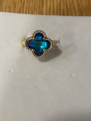 Anillo laminado en oro de 14 quilates con un precioso diseño de trébol. - Diseño de trébol con piedras azules y verdes. - Acabado dorado brillante.
