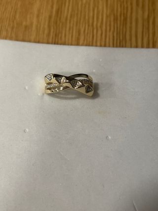 Anillo laminado con un diseño entrelazado y detalles brillantes. - Material: Oro laminado 14k. - Talla: 8 (diámetro interior 18.1 mm).