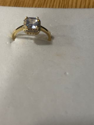 Anillo laminado con un diseño elegante y una piedra central brillante. - Laminado en oro 14k. - Talla 7 (diámetro aproximado de 17.3 mm). - Piedra central de color blanco.