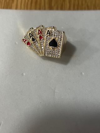 Anillo con diseño de cartas de póker, laminado en oro de 14 quilates. - Diseño de cuatro ases. - Detalle de piedras brillantes. - Estilo llamativo y moderno.