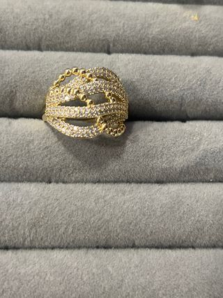 Elegante anillo chapado en oro de 14 quilates. Su diseño moderno y brillante lo hace perfecto para cualquier ocasión. - Diseño con múltiples bandas entrelazadas. - Incrustaciones de pequeñas piedras brillantes.