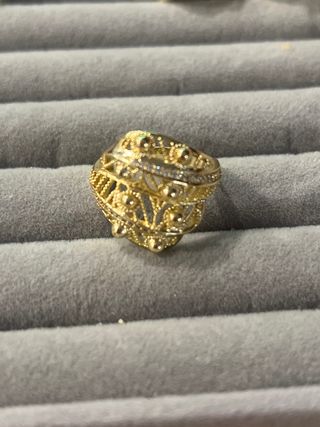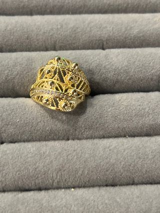 Elegante anillo de oro laminado de 14 quilates. Su diseño intrincado y los pequeños detalles de circonitas le dan un toque especial. - Diseño calado con circonitas. - Acabado brillante.