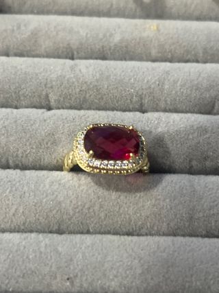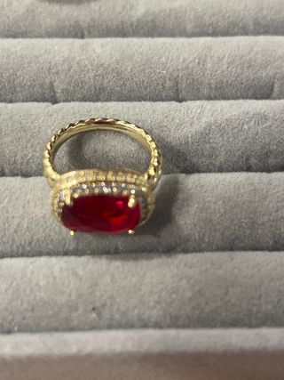 Elegante anillo laminado en oro de 14 quilates, talla 8. Presenta una llamativa piedra central de color rojo, rodeada por un delicado borde de pequeñas gemas brillantes. - Diseño con detalles trenzados en el aro. - Piedra central tallada en forma ovalada. - Acompañado de gemas transparentes alrededor del diseño principal.