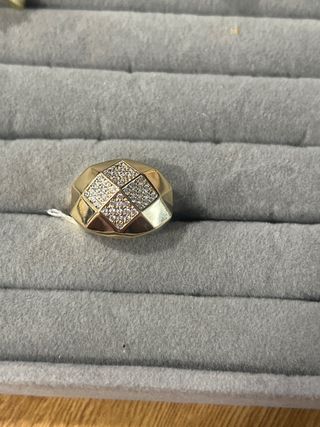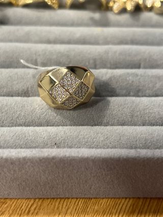 Elegante anillo laminado en oro de 14 quilates. - Diseño con patrón de rombos. - Incrustaciones de pequeñas piedras brillantes. - Talla 6 (16.5 mm).