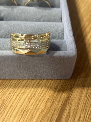 Elegante anillo laminado en oro de 14 quilates. Diseño moderno con detalles brillantes. - Talla 8 (17.3 mm). - Acabado dorado y plateado.