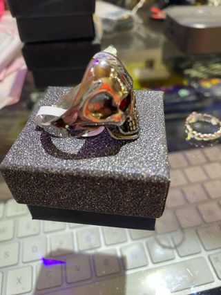 Anillo con diseño de calavera y detalles plateados. - Ojos con incrustaciones rojas. - Acabado metálico brillante. Acero inoxidable No es ajustable,. Tengo dos, uno es talla 23 mm y otro 24 mm